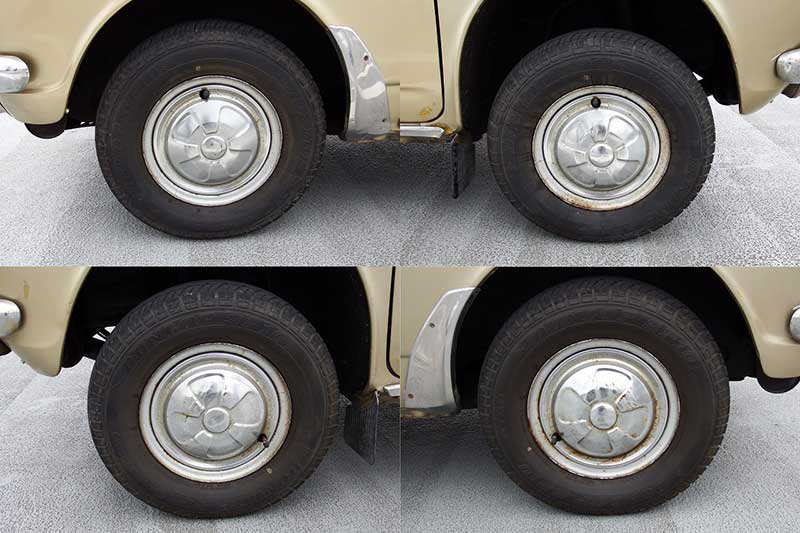 各所に塗装のヤレ、キズや凹みの補修跡、ドア下等にサビが見受けられますが、50年間普通に使っていた車としては良いコンディションが維持されている方だと思います。