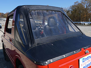 幌トップを外し、オープン状態でも走りましたが、ツースト、特有の気になる白煙や匂いもほとんど感じられず、大人2名乗車での急坂登坂時の非力さはあるものの、アスファルト走行、未舗装道路は快適に走行できました。