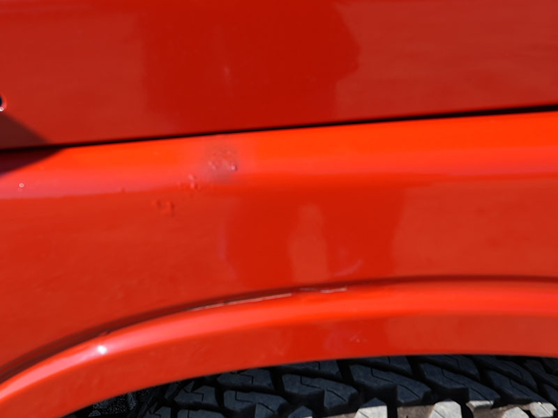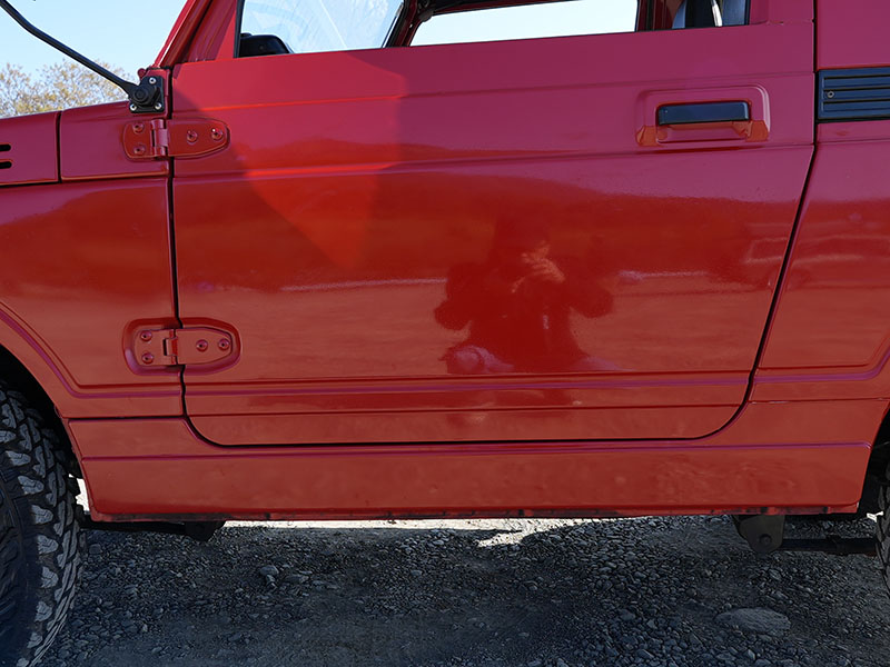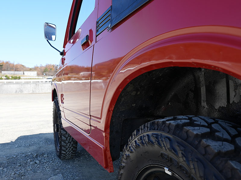 純正塗色 アップルレッド2(当時のスズキ自動車のカタログカラーです)。ホワイトボディー(どんがら)から手作業で全塗装済です (約20年前施工)。外観は光沢があり美しいですが、細かな塗装ムラ、ブツや飛び石による小さな塗装の剥げなどがございます。画像参照及び現車をご確認ください。