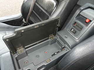 シート後部のリヤトレイにロールバー用の穴があり、テープで目隠ししています。
