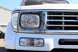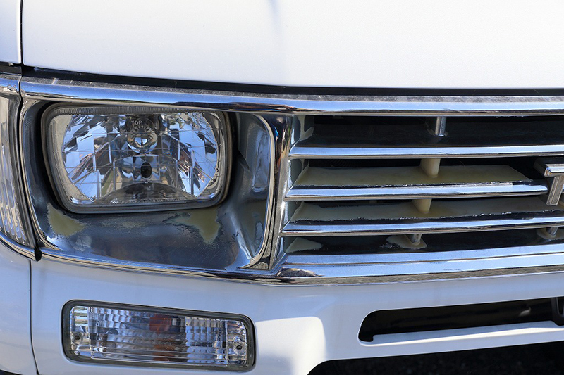 ほとんど欠点のない外装ですが、フロントグリル(樹脂製)のメッキが一部剥がれており、フロントバンパー上部に点錆びがありました。フロントグリルは黒で塗り替えても精悍になりそうですし、点錆びは薄そうですので磨けば取れそうです。