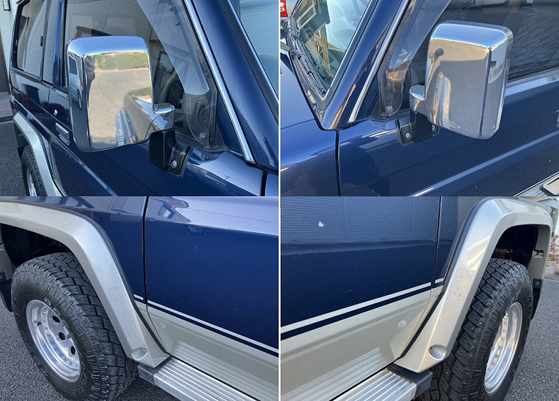助手席側ドア中央付近及びドアミラーに小傷がございます。