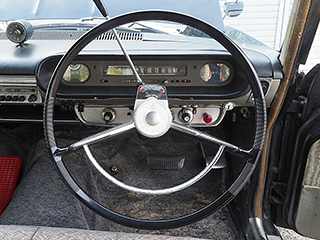 ステアリング、外径は、およそ450mmほどで現代の一般的な車のハンドルは370mm前後が多いようで、直径で8cmほどの差があります。大径で細身のステアリングを通すととてもメーターが見やすいです。 |