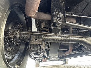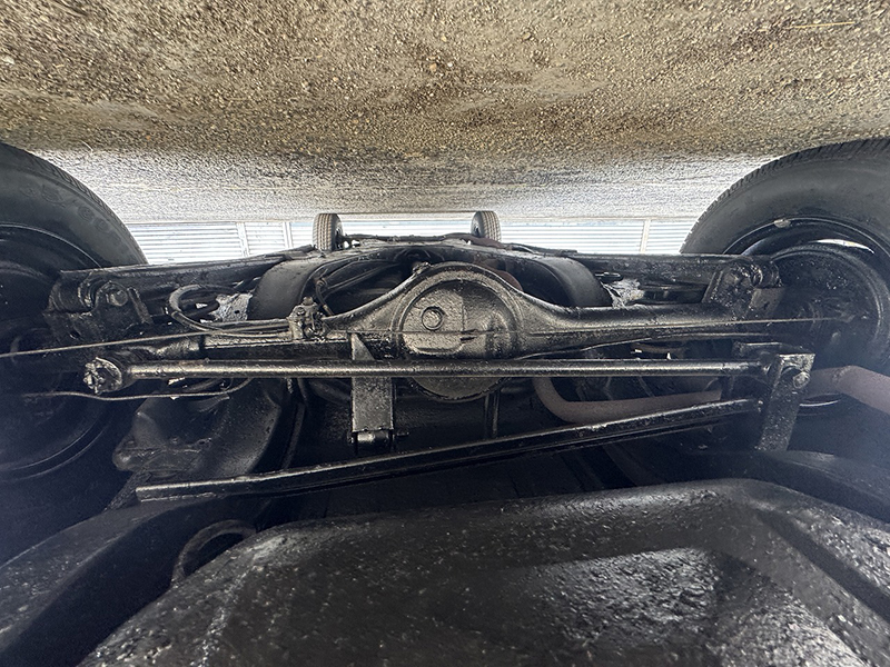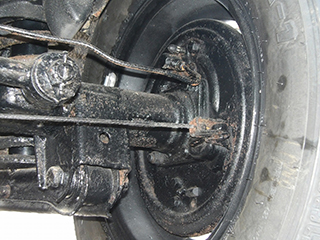 リアサスペンション回り、ブレーキドラムと、そこに繋がるブレーキライン、サイドブレーキのワイヤーが非常にクリアに見えます。 |