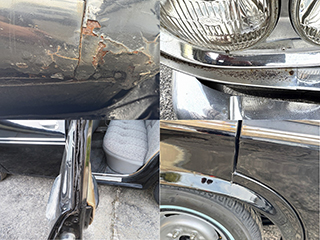 左上:後輪前の塗装剥げ、サビの様子。右上:メッキパーツのサビ。左下:ウェザーストリップ劣化の様子。右下:フェンダー部のクラック。 |
