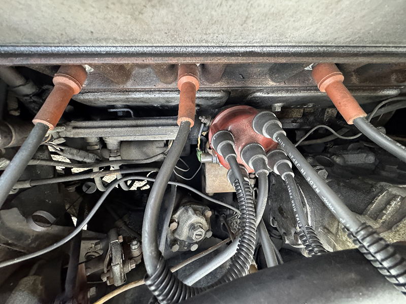 デスビ回りの様子、SEIWA(清和工業)のハイパワー・プラグコードが使われています。 |