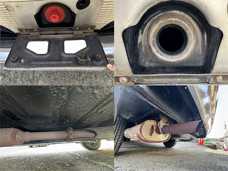 給油口はリアのナンバープレートを開くと出てきます。給油口から覗ける範囲は目視ですがきれいな状態に見受けられます。排気管は年式相応のサビが見られます。マフラーも年式相応に見受けられます。 |
