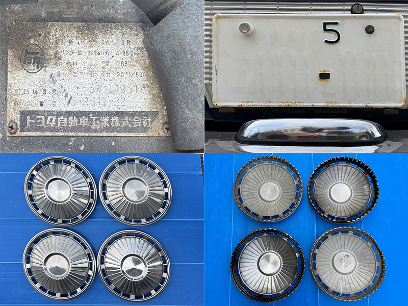 左上:車両プラック、車検証記載の番号と合致します。(一部数字は隠しています。)右上:貴重なシングル5ナンバー。左下:オリジナルホイールキャップ表側。右下:オリジナルホイールキャップ裏側。右上:貴重な一桁5ナンバー。左下:オリジナルホイールキャップ表側。右下:オリジナルホイールキャップ裏側。 |
