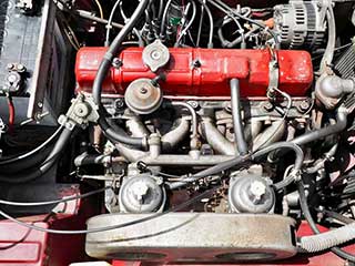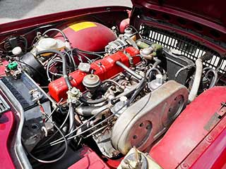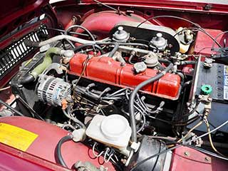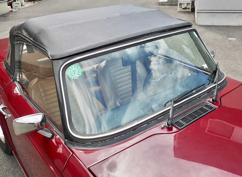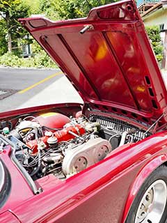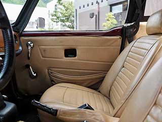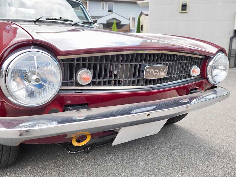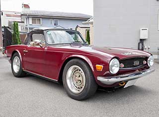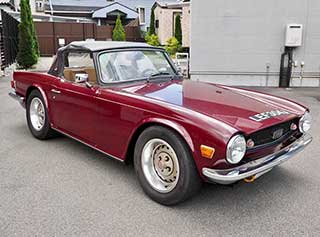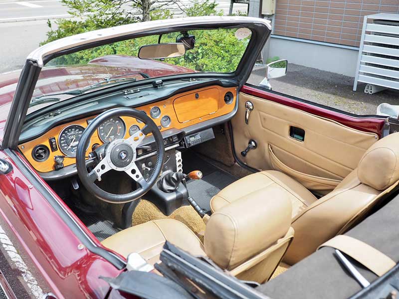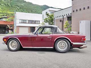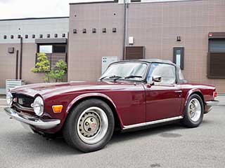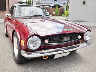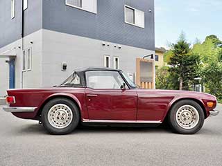戦後の英国スポーツカー史を語るとき、トライアンフの名を外すことはできません・・・。 そのトライアンフによるTRシリーズの誕生は1953年の「TR2」に遡ります・・・。 周知の如く、シリーズ誕生以来、TRは英国車の一つの文化的象徴ともなります・・・。 なぜトライアンフはミケロッティにTR4のデザインを依頼したのか・・・? 1950年代後半、トライアンフ社は北米輸出を中心とした戦後のスポーツカー市場で急速に成長していました・・・。 しかし1950年代末、アメリカではすでにスポーツカーの近代化の波が押し寄せおり、ジャガーEタイプ、MG-A、そしてイタリア勢のアルファロメオ・ジュリエッタ・スパイダーなど、より洗練されたスタイリングと快適装備を備えた車が続々と登場していたのです・・・。 当時のトライアンフ社長、サー・ジョン・ブラック氏は、こうした時代の潮流に対応すべく、「古典的ロードスターから脱却し、イタリア的モダンデザインを纏ったグランドツアラーへ進化させる必要がある」と強く感じていました・・・。 その答えが──イタリア人カロッツェリアの巨匠ジョヴァンニ・ミケロッティ氏へのデザイン依頼だったのです・・・。 1957年、トライアンフはミケロッティにTR3をベースにした「プロトタイプ・クーペ」のデザインを試作として依頼します・・・。 TR4は結果として、英国車でありながらイタリアの美意識と、英国の自動車工学が融合した初の“インターナショナル・ブリティッシュ・スポーツ”として高く評価され、そのデザインDNAは、このTR6にまで連綿と受け継がれてゆくことになります・・・。 TR4は、当時としては画期的な直線基調のデザインを持つもので、フラットなボンネットと張り出したフェンダーライン、そして美しいサイドのプレスラインが特徴・・・。それはもはや“スポーツカー”というよりも、“グランドツアラー(GT)”の風格を備えていたものでした・・・。 その後TR5では、ミケロッティのデザインを受け継ぎつつ、機構的にもさらに革新が進みます・・・。 しかしながら、他メーカー同様・・・、第一次オイルショックなどを経験し、自動車を取り巻く環境はいつも刻々と流れを変えて行くもの・・・。 そこで採られたのが、TR5のボディ構造をそのまま流用し、フロントとリアのエクステリアのみをドイツのカロッツェリア、カルマン社に委託するという手法でした・・・。 その結果、TR6は「イタリアン・エレガンス」と「ドイツ的合理性」を融合した、極めて完成度の高いデザインを手に入れました・・・。 TR6の心臓部に搭載されるのは、トライアンフ伝統のブリティッシュ・シックス・2.5リッター直列6気筒OHVエンジン・・・。 英国仕様のTR5が、初のルーカス製メカニカル・インジェクションによって150bhpを誇ったのに対し、TR6では当時の北米排ガス規制に対応するため、ゼニス・ストロンバーグ製CD175ツイン・キャブレターによる吸気システムが採用されました・・・。 また、このもう二度と今後作られることないエンジンこそTR6を心から楽しむ重要な要素・・・! アルミ合金製ロッカーカバーの下に鋳鉄製ブロックを持つ、堅牢なプッシュロッド駆動の古典的OHV方式は、現代的なOHCに比べるとものすごくシンプルですが・・・、なんと言っても機械としての“密度感”と金属的フィーリングが味わい強く感じられるもの・・・。 この75年式の個体もツイン・ストロンバーグ・キャブの同調がバッチリ取れており、アクセルオンでのフィーリングは格別・・・! そうこのクルマは・・・、眉間に皺を寄せて、見えない彼方を必死に見開きながら6000rpmを超えて無理に回すような性格で全くありません・・・(笑)。 低いボンネットに収まった、この古典的ブリティッシュ・シックスを眺めるのもまた味わい深いもの・・・。 トランスミッションは堅牢な4速+オーバードライブ付きで、3速と4速でオーバードライブが機能する独特のものです・・・。 シャーシは、60年代英国スポーツカーを表現する“バックボーン・フレーム”をベースに、TR4A以降の独立懸架サスペンションをモダンに採用・・・。 ブレーキはフロントがディスク、リアがドラム・・・。 総じてTR6は、決してものすごく速いクルマではありません・・・。