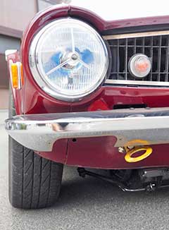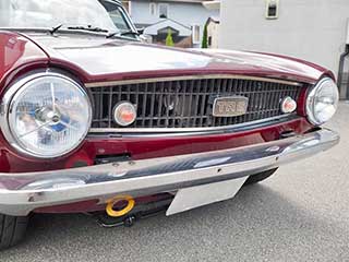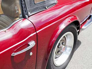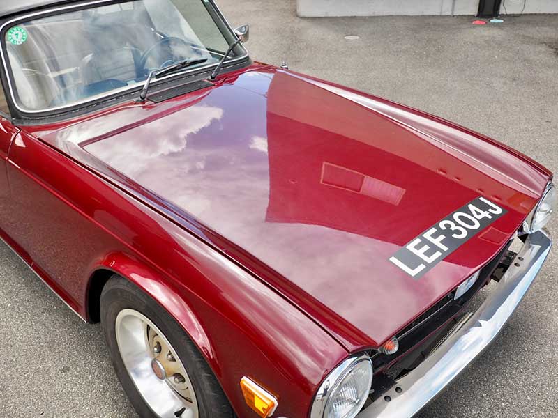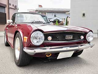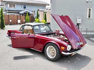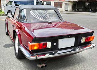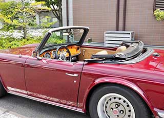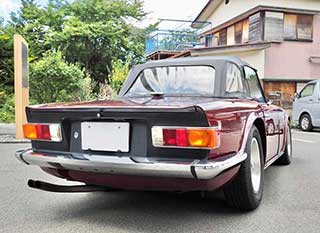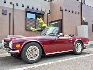 「手で描いたデザインでないと絶対に表現できない・・・、CAD中心の今の自動車デザインではもう二度と現れることがないであろう・・・。」 真夏の太陽の下、トライアンフらしいオリジナルカラー、ダムソンレッドが太陽光線を浴びて、ミケロッティが感性で描いた流麗な長いノーズの表情が刻々と変化する様子は、眺めているだけでも感銘的・・・。 サイドラインは1960年台の英国車にみられる、リア・フェンダーからボリューム感たっぷりに盛り上がるデザインの残響を見せながら、テールエンドに至ってはまさにTR6最大の見どころで、仮想ロングテール“コーダ・トロンカ”処理が施され、流麗なロングテールを途中で切り落とすことで、 学生時代から英国車に強い憧れを抱いておられたというオーナー氏・・・。 この75年式の個体を手に入れたのは、今から5年前のこと・・・。 奥様もまた、かつてクラシック・ミニを愛用されていたとのことで、いつもガレージでTR6を一緒に整備したり、出かけたり・・・。 これは、5年以上手厚いメンテナンスを受け、家族同様に大切にしてこられた一台のTR6・・・。 そこには単なる旧い英国車という姿だけではなく、稀有なデザイン含め、自動車文化そのものを愉しみ尽くした軌跡が明らかに存在します・・・。 次章では、その源流・・・、トライアンフという名が築いた歴史と、TR6の系譜から、更にこの貴重な一台を深掘りしてご紹介して参ります・・・。