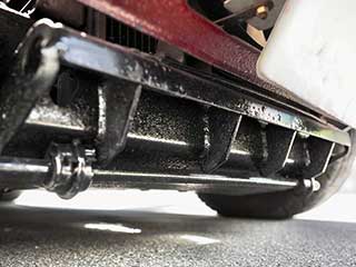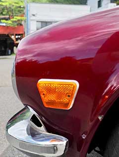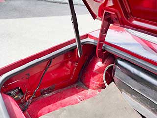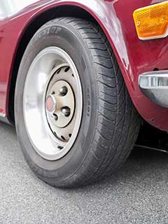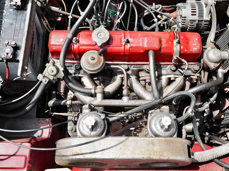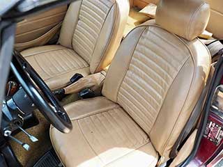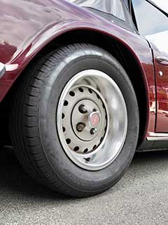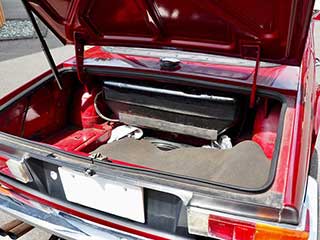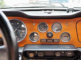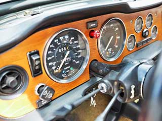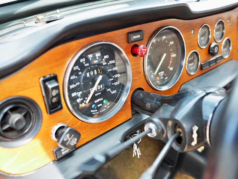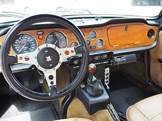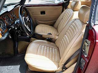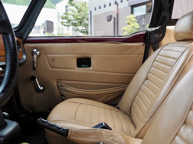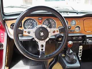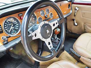 ブラウンの要素を帯びた濃厚なバーガンディ(トライアンフカラー・ダムソンレッド)は、英国車の伝統とイタリアン・デザインの気品を絶妙に融合させた色調であり、このクルマの時代と文化を象徴する存在でもあります・・・。 シャーシ番号CF35089UO・・・ ボンネットを開けると、そこに鎮座するのはトライアンフ製2498cc直列6気筒OHVユニット。 シャーシには防錆処理としてシャーシブラックが丁寧に塗布され、下回りの状態も極めて良好です・・・。足回りはフロント・ダブルウィッシュボーン/リア・セミトレーリングアームの独立懸架・・・。 ホイールはオリジナル15インチのスチールリムに、ハイトの高いタイヤ(215/65R15)が装着されています・・・。 各種クロームリングの輝き・・・、グローブをしていても触れるという、大きめのスイッチ類の質感、そしてレバーの手応え・・・、どれもが半世紀の時を経てなお生き生きとしています・・・!