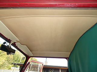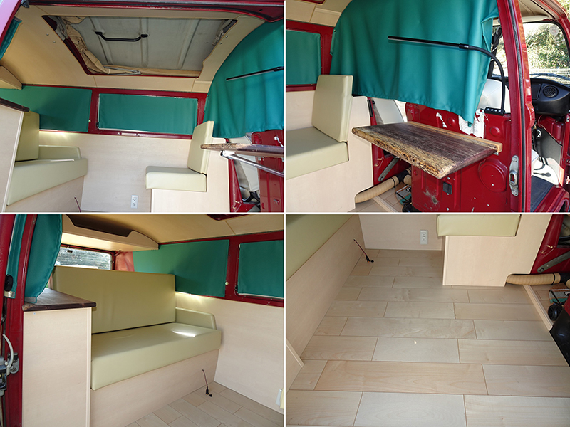 前席の天井、後席部を囲む内装、フロア、天井などベニア板を使用し作成していますので家のラウンジのように仕上がっています。(作業は大工さんかも?)